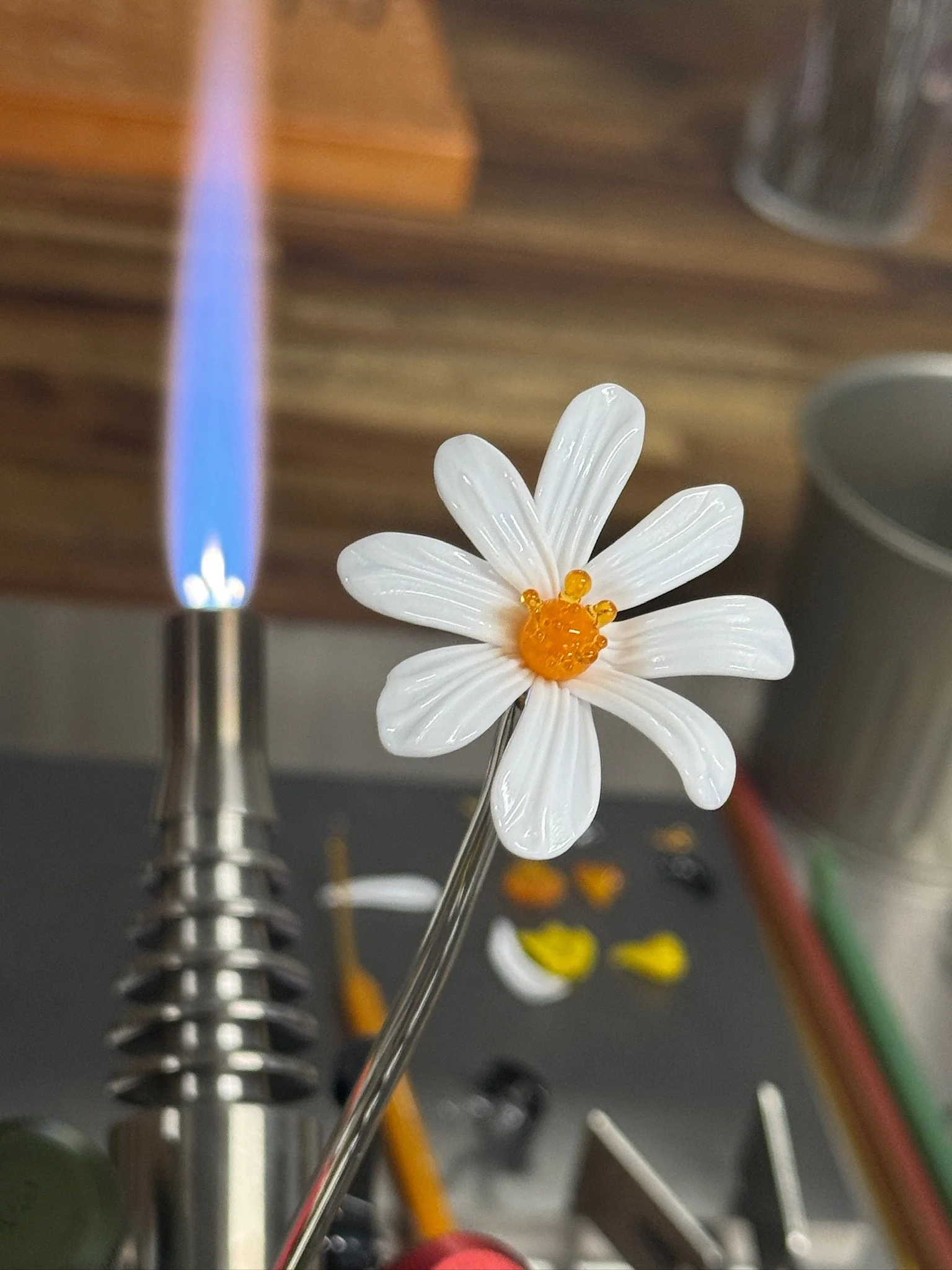 Discover the art of lampworking and create your own delicate glass flower. Learn how to safely use a torch to melt and shape glass rods, forming beautiful floral designs inside clear glass. Guided step by step, you’ll explore basic techniques such as heating, shaping, layering, and color application.